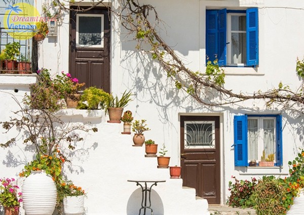 Những căn nhà xếp lớp cao dần theo hình bậc thang, chênh vênh bên sườn núi tạo nên vẻ đẹp đặc trưng cho Santorini. Đặt chân đến hòn đảo này, du khách sẽ có cảm giác như lạc vào cõi thiên đường, bởi tất cả công trình ở Santorini đều được sơn trắng - từ nhà thờ, nhà ở đến các khách sạn, tất cả đều nổi bật trên nền đại dương và bầu trời xanh ngắt. Những ngôi nhà màu trắng, mái sơn xanh coban đặc trưng, các quán cà phê xinh xắn với tông màu trắng tinh khôi khiến du khách không nỡ rời bước.