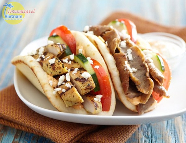 Món bánh sandwich pita kẹp với thịt nướng, cà chua, dưa leo và được rắc tỏi lên trên