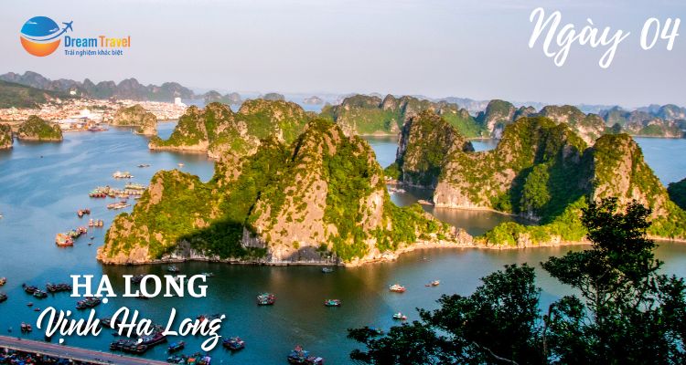 12h00: Quý khách có mặt tại bến tàu du lịch Tuần Châu, HDV của Dream Travel làm thủ tục cho Quý khách lên tàu bắt đầu hành trình tham quan Vịnh Hạ Long. Quý khách ăn trưa trên tàu và tận mắt chiêm ngưỡng vẻ đẹp huyền bí của Vịnh Hạ Long với hàng ngàn hòn đảo lớn nhỏ khác nhau trong vòng 4 tiếng. Trên đường đi Quý Khách có cơ hộ ngắm nhìn làng chài trên vịnh, ngắm hòn Chó Đá, hòn Gà Chọi, thăm động Thiên Cung…một trong những hang động đẹp nhất của vịnh Hạ Long.